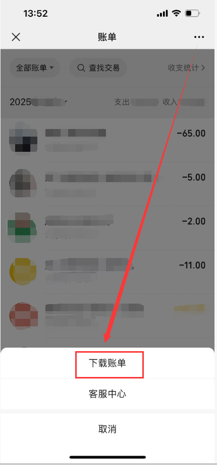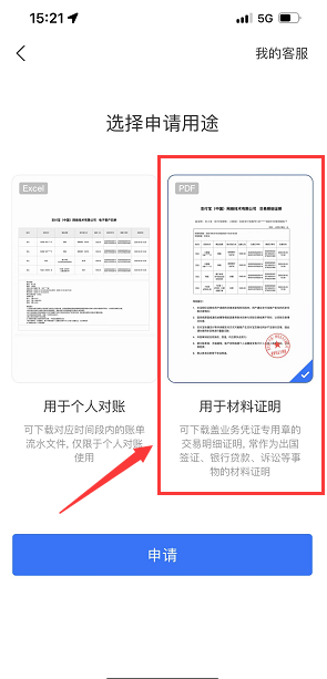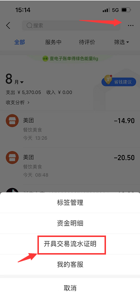 2.在账单里点击下右上角的“...”,请选择“开具交易流水证明”,选择申请用途:用于材料证明,点击申请。