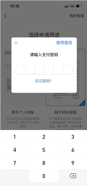 3.因账单涉及个人隐私,支付宝官方需要您输入支付密码验证您的身份,后进入到“选择交易流水范围”的界面,请选择调取流水的开始和结束日期(即第一笔扣费和最后一笔扣费的时间),确认后点击“下一步”。