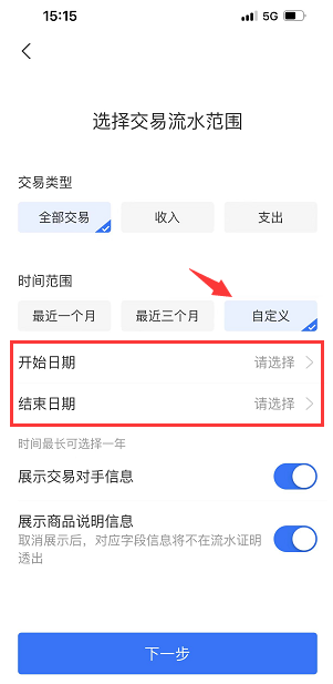 3.进入账单下载用途选择界面,选择用作证明材料,点击自定义时间,选择调取的流水的开始和结束日期(即第一笔扣费和最后一笔扣费的时间),输入好后点击“下一步”。