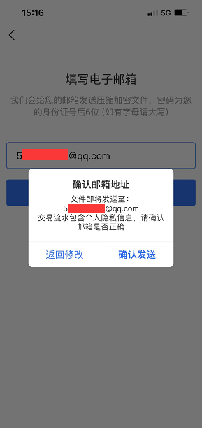 4.请输入接收支付宝流水账单的邮箱(务必为您个人有效邮箱),二次确认无误后点击“确认发送”。