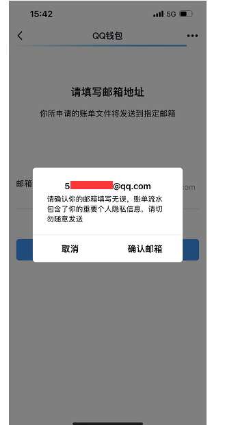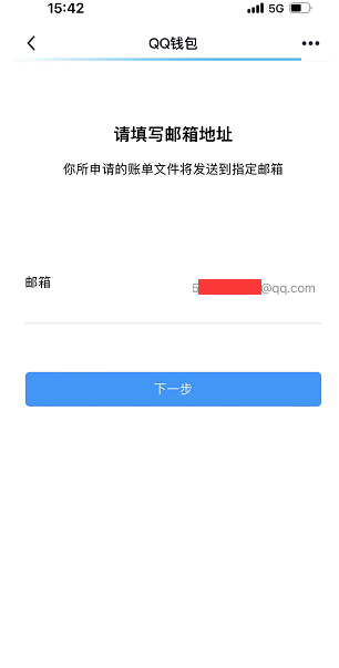 4.输入接收QQ钱包流水账单的邮箱(务必填写您个人有效的邮箱地址),然后点击“下一步”,再次确认您的邮箱地址无误。