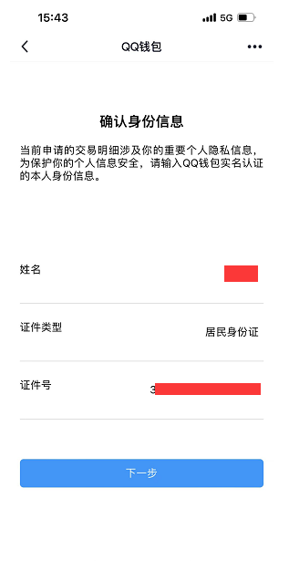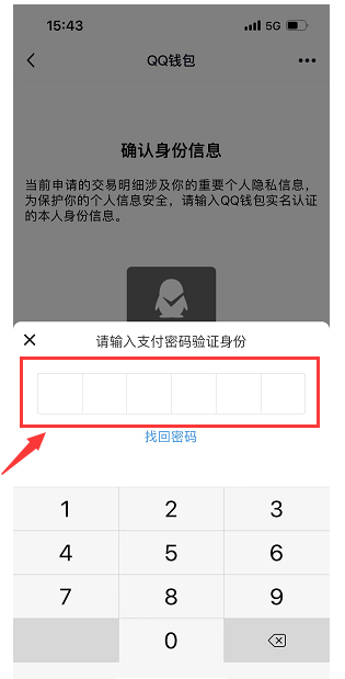 5.因账单涉及个人隐私,为保证信息安全,需要您输入QQ钱包实名的姓名、身份证号码,并输入正确的支付密码。