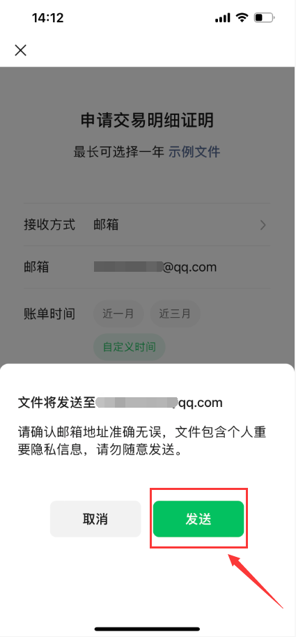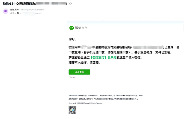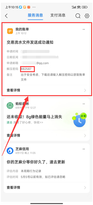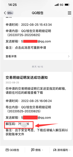 6.信息无误后即可在24小时内查收您的流水账单,同时QQ钱包会给通过QQ您发送交易明细证明发送成功并附带解压码的通知,届时您可以登录邮箱查收您的流水证明了。