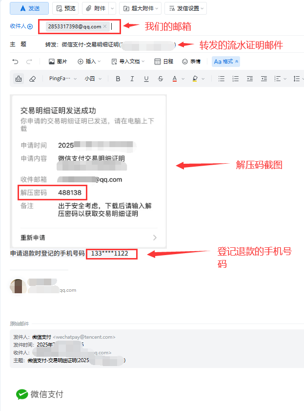 ②登录您的邮箱查收微信流水源文件,点击“转发”按钮,在正文附上您的解压码截图以及您登记申请退款的手机号码,转发的收件邮箱地址为:2853317398@qq.com。