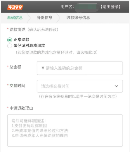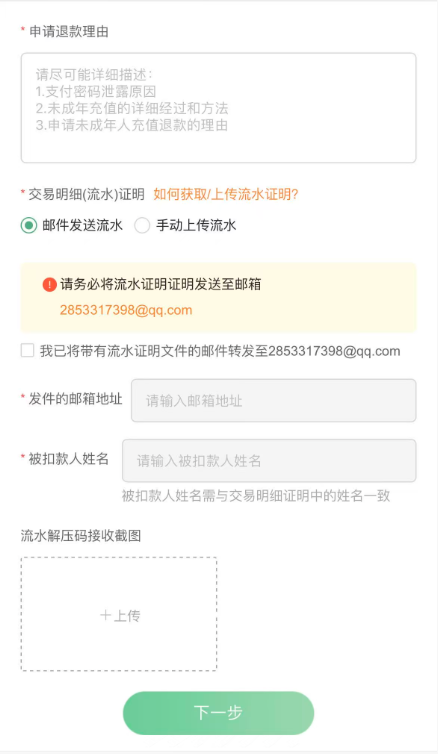 1.基础信息:此次申请退款涉及的金额、时间、退款的理由(具体阐述充值事件的原因以及经过)以及具体的扣费流水源文件(可转发至客服邮箱也可直接上传)