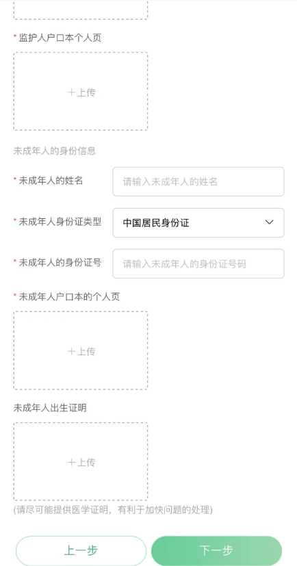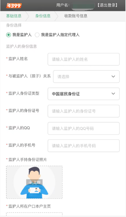 2.身份信息:填写监护人姓名、身份证、联系手机、QQ号码和未成年姓名、身份证以及关联的手持身份证、户籍材料、出生证明等确认身份和关系的材料。