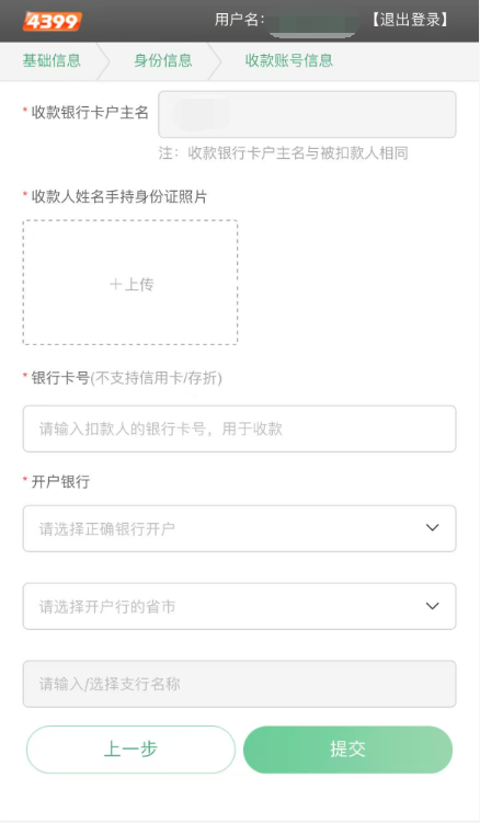 3.收款账号信息:填写收款人(同扣款人)的姓名、收款账户信息(银行卡号、开户行信息)以及收款人(同扣款人)手持身份证。