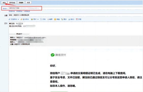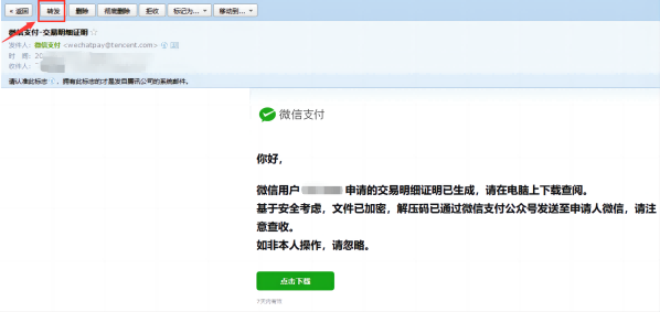 8.登录接收流水文件的邮箱,找到这封微信支付给您发送的流水邮件,点击下载并输入解压码即可查看流水凭证,交易方为4399即为充值至我司的扣费凭证。