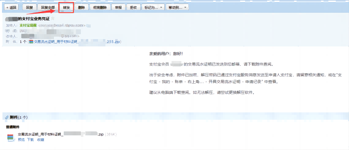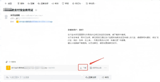7.登陆接收流水的邮箱,找到这封支付宝发的流水凭证邮件,邮件的主题一般是:XXX的支付宝业务凭证,发件人是:支付宝提醒 。点击下载,输入解压码,即可查看您的交易证明流水文件。