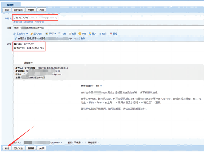 ②您是通过手机移动端填写问卷,需要您转发给我们哦,打开这封支付宝提醒发送给您的邮件,点击转发,收件邮箱填写:2853317398@qq.com,邮件内容补充解压码、申请退款时登记的联系方式或者问卷上填写的监护人联系方式,以便我们能够及时且准确定位查收,最后记得要在问卷上填写您接收流水源文件的邮箱地址哦。