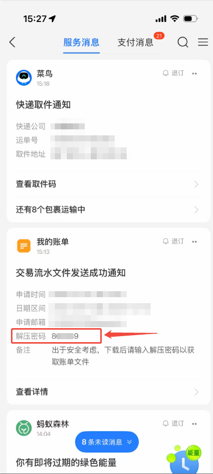 6.返回支付宝,点击消息,查看交易流水文件发送成功的通知,点击查看解压码。