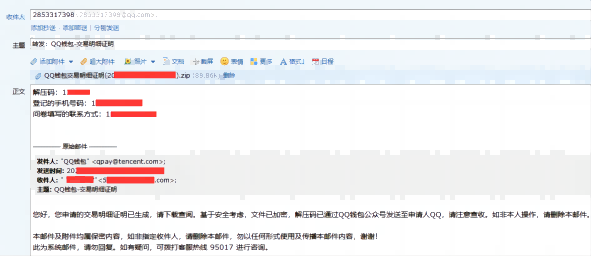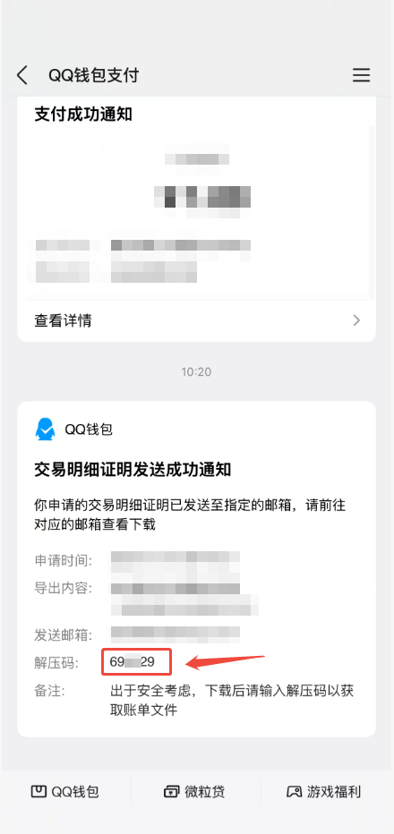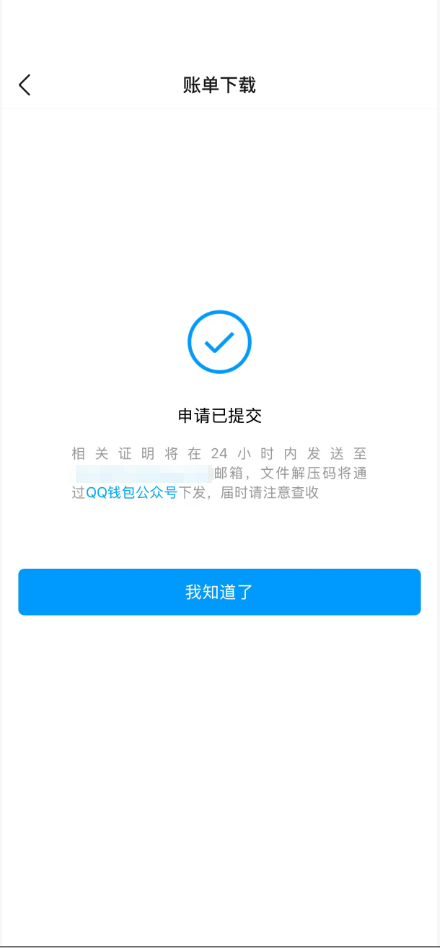 6.信息无误后,QQ钱包会在24小时内通过公众号提醒您查收流水文件,并给您发送查收流水文件的解压码,届时您可以登录对应邮箱进行查收。