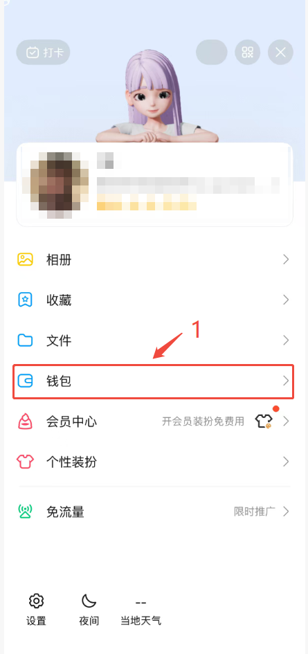 1.打开扣费的QQ,点击QQ头像,进入索引栏,选择钱包。
