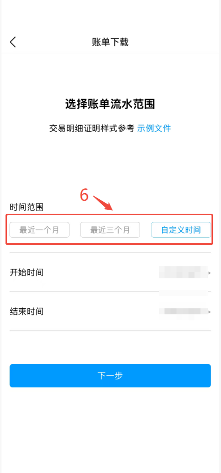 4.根据个人需要选择指定时间段的记录,可以是一个月、三个月以及自定义时间,输入好后点击下一步。