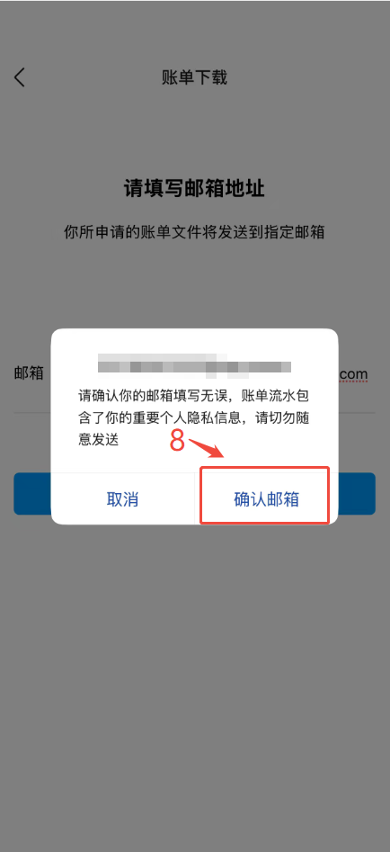 5.输入接收QQ钱包流水账单的邮箱(务必填写您个人有效的邮箱地址),再次确认您的邮箱地址无误,然后点击“确认邮箱”。