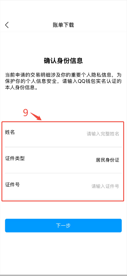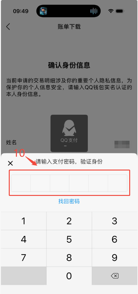 6.因账单涉及个人隐私,为保证信息安全,需要您输入QQ钱包绑定的身份信息:姓名、身份证号码,并输入正确的支付密码以确保本人申请。