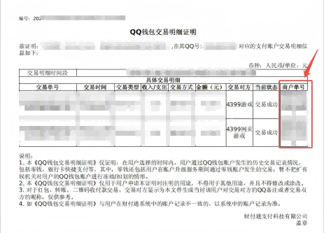 7.登陆接收流水的邮箱,找到这封QQ钱包发的流水凭证邮件,邮件的主题一般是:QQ钱包-交易明细证明,发件人是:QQ钱包。您通过解压码打开的流水文件,交易方为4399即扣费至我司的账单,如下: