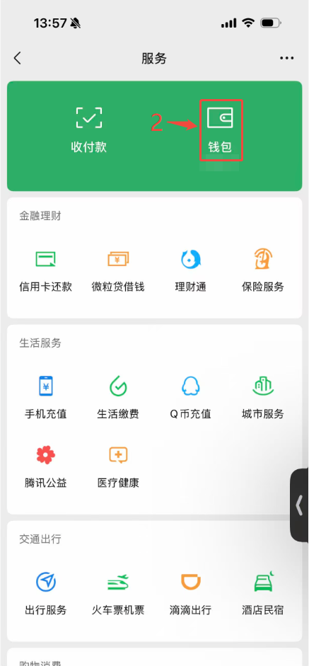 1.打开微信-“我”-“服务”-“钱包”。