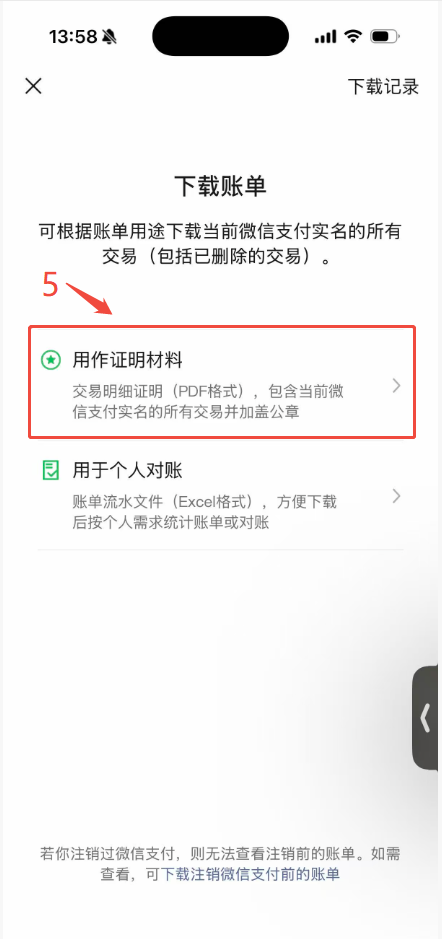 3.选择下载账单的用途“用作证明材料”。
