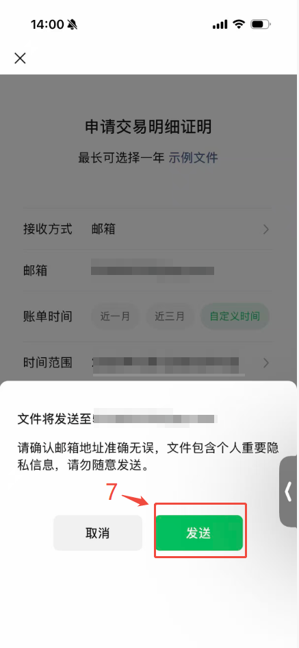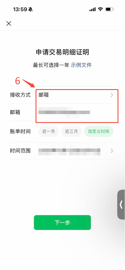 4.在申请交易明细页面,接收方式默认微信(您也可以选择通过邮箱接收),选择您要申请账单的时间段:近1周、近1个月以及自定义时间,确认后点击下一步再次确认您的邮箱地址。