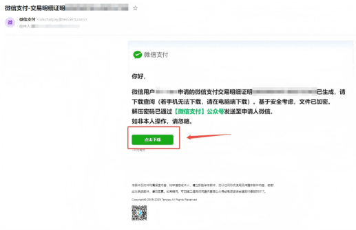 8.登录您接收流水的邮箱,找到这封微信支付发送的流水文件邮件,点击下载并输入解压码即可查看您的流水证明,交易对方为4399的即为充值至我司的凭证,对应的商户单号则为对应的扣费订单哦。