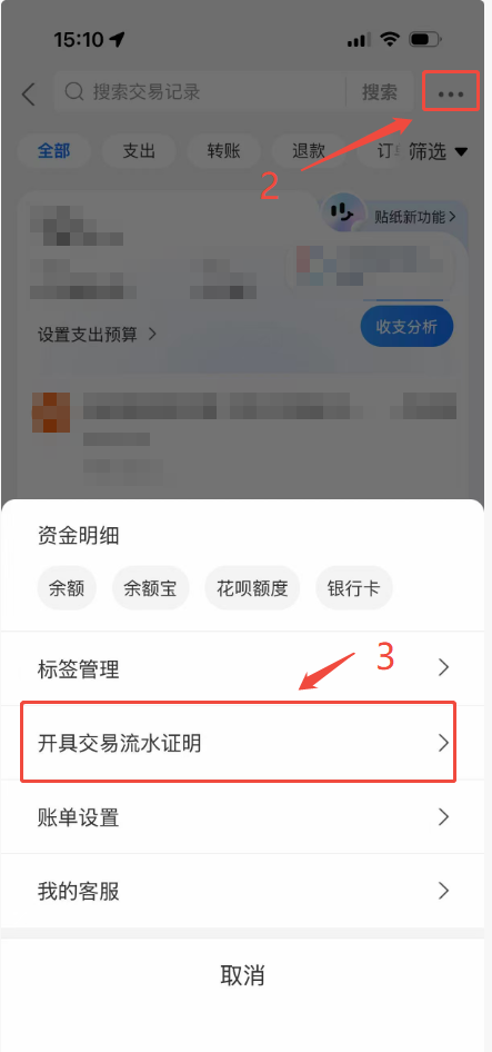 2.点击下右上角的“...”,选择“开具交易流水证明”。