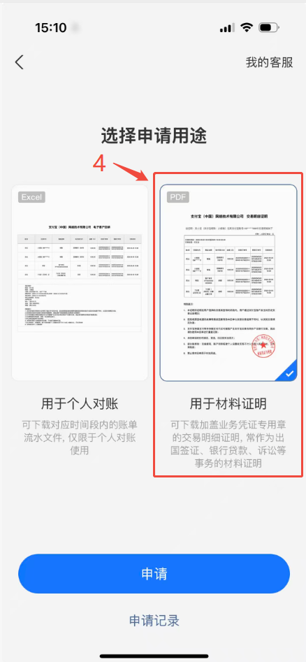 3.选择“用作证明材料”,点击申请。