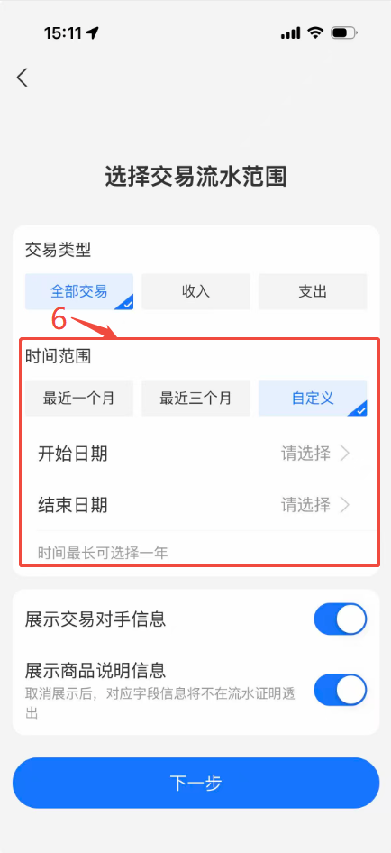 5.支付密码确认无误后,进入到“选择交易流水范围”的界面,请选择交易类型:全部交易;时间范围可以根据您的需要进行选择,确认后点击“下一步”。
