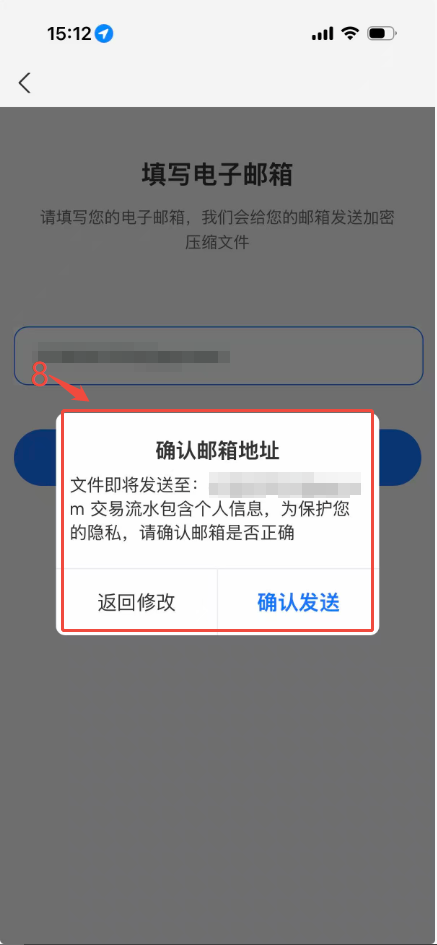 6.请输入接收支付宝流水账单的邮箱(务必为有效邮箱且您能够打开获取邮件信息的邮箱),点击“发送”,二次确认无误后点击“确认发送”。