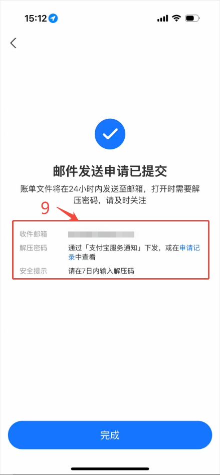 5.申请提交后,支付宝会在24小时内给您发送流水文件,同时通过支付宝服务下发流水解压码。