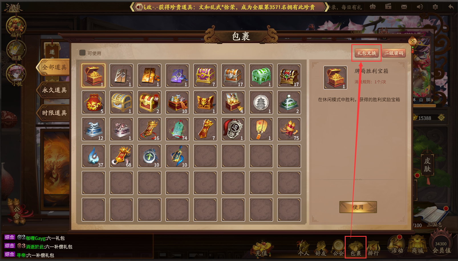 2.输入礼包激活码,点击兑换礼包,领取成功后奖励会自动发放到包裹。