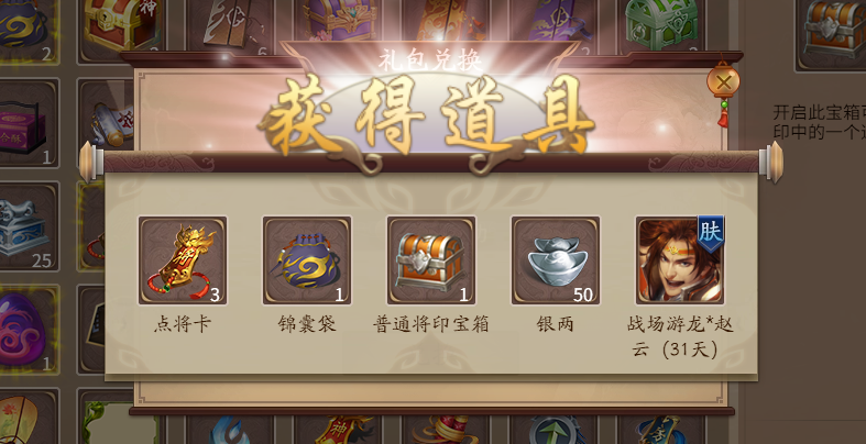 礼包内容:战场游龙*赵云*31天,锦囊袋*1,点将卡*3,普通将印宝箱*1,银两*50