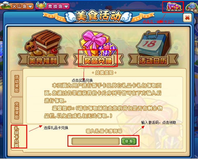 1.游戏礼包码可以通过游戏内右上角点击美食活动-奖品兑换,选择礼品卡兑换-输入激活码-领取。